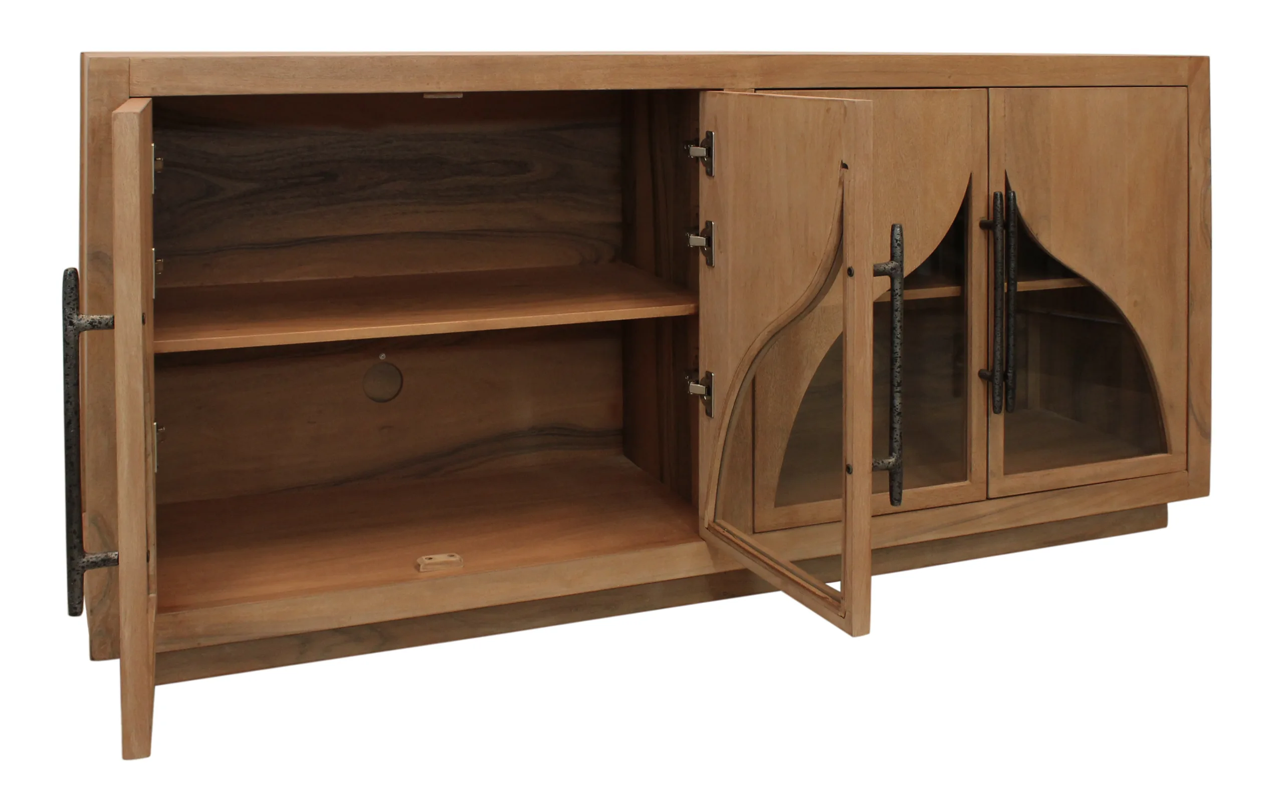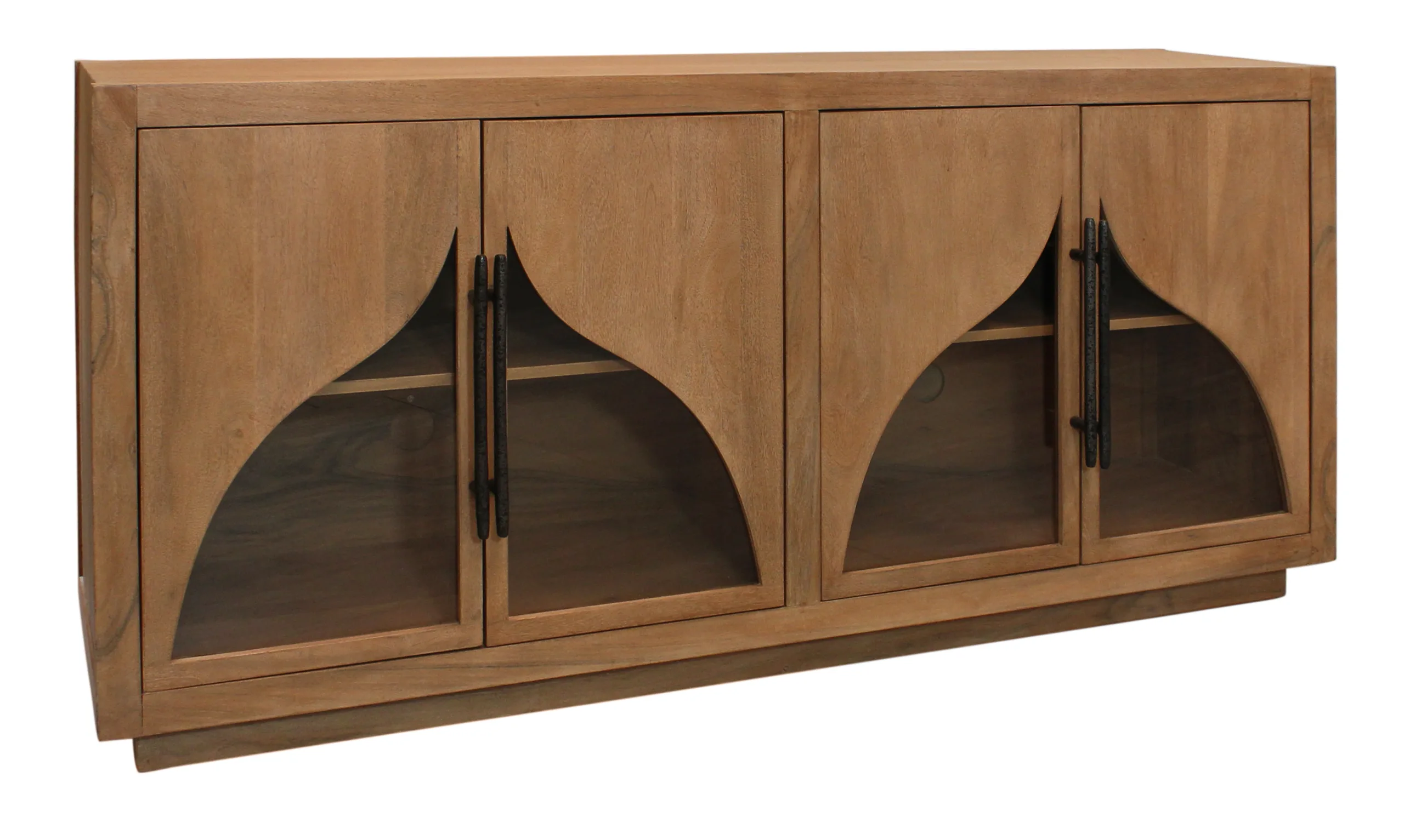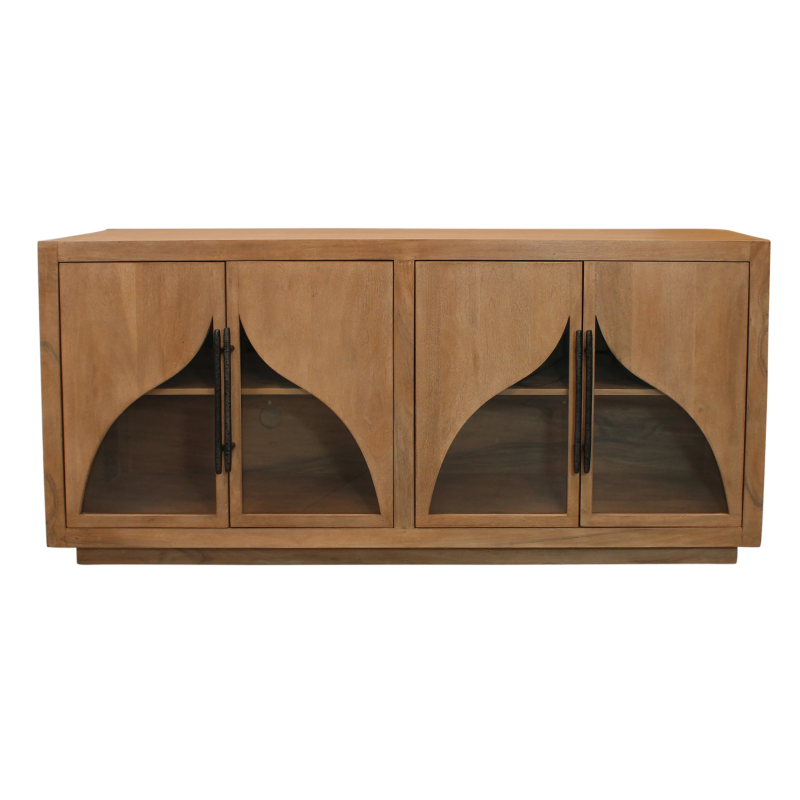 This beautiful solid wood sideboard is masterfully crafted from authentic acacia wood with a natural finish. Four cabinet doors feature artful curved glass panels and iron handles that open to shelved interior cabinet space, allowing for organization and elegance.