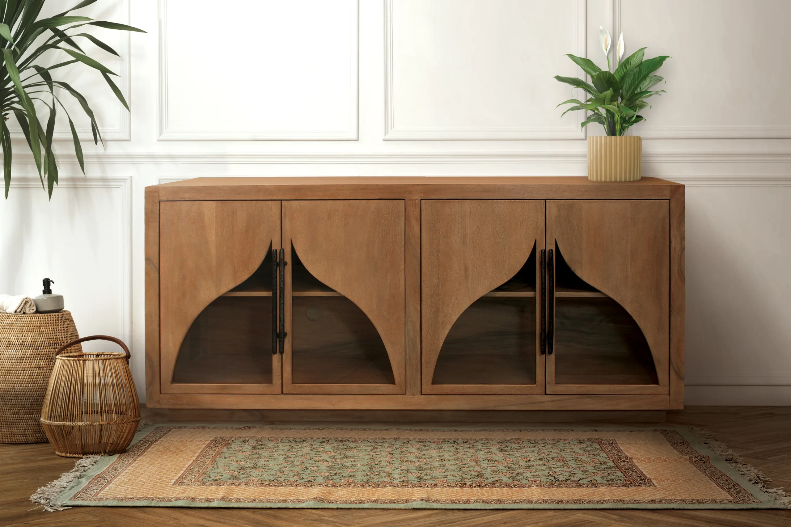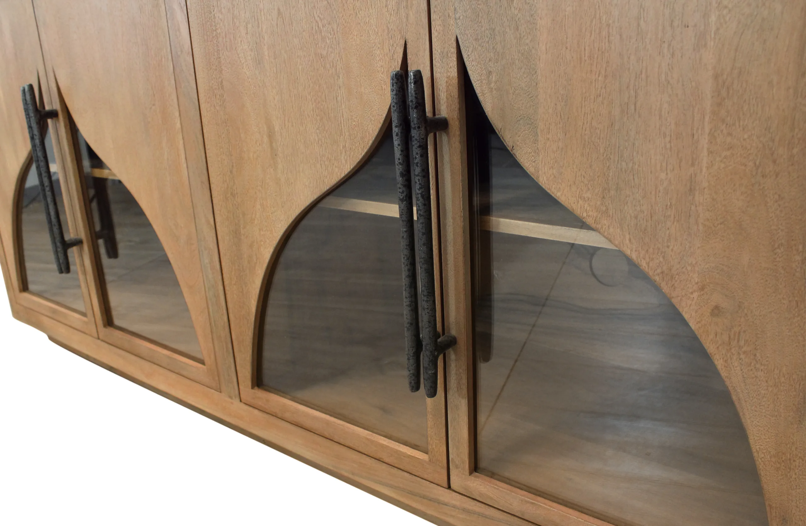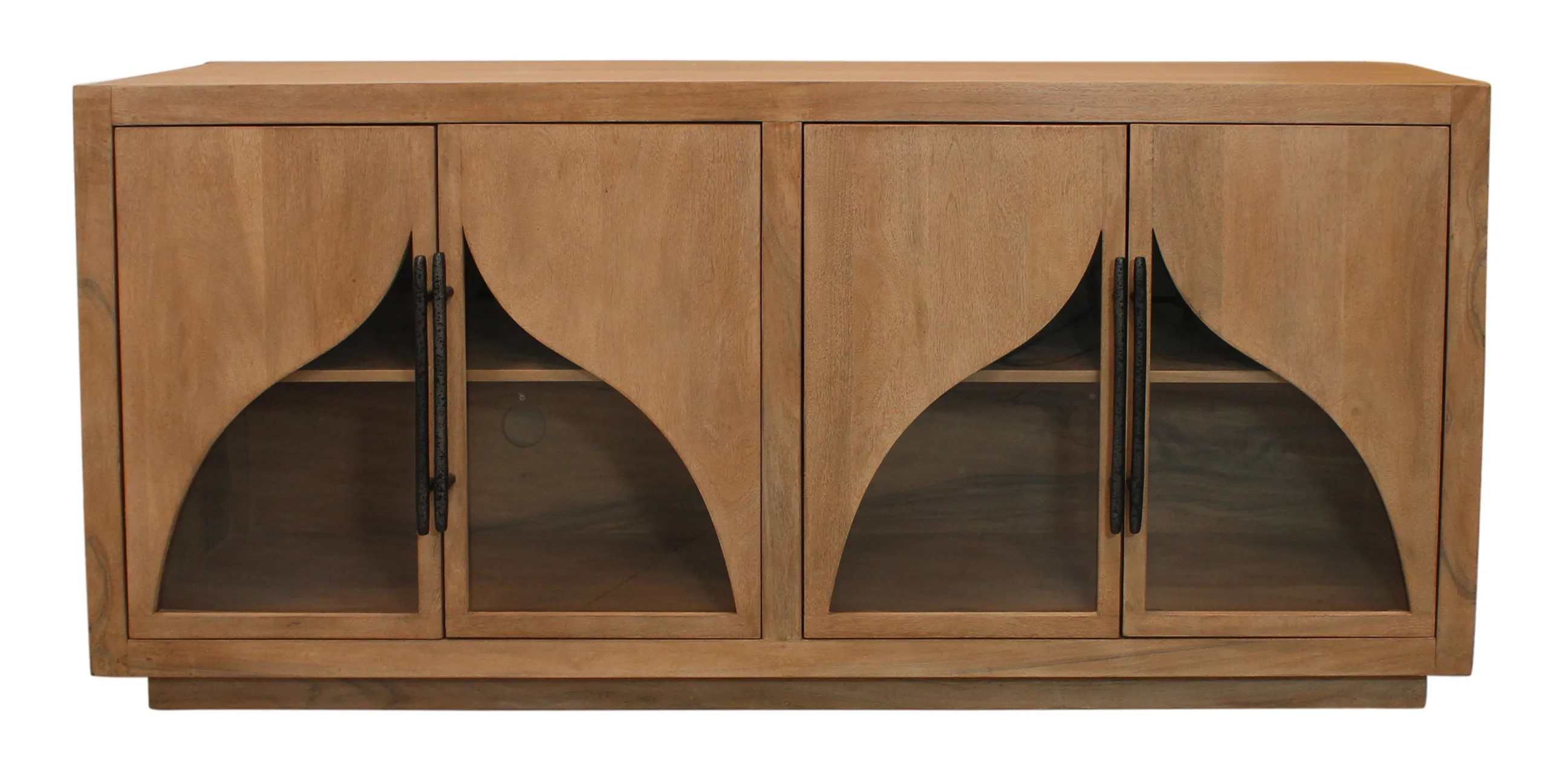 This beautiful solid wood sideboard is masterfully crafted from authentic acacia wood with a natural finish. Four cabinet doors feature artful curved glass panels and iron handles that open to shelved interior cabinet space, allowing for organization and elegance.