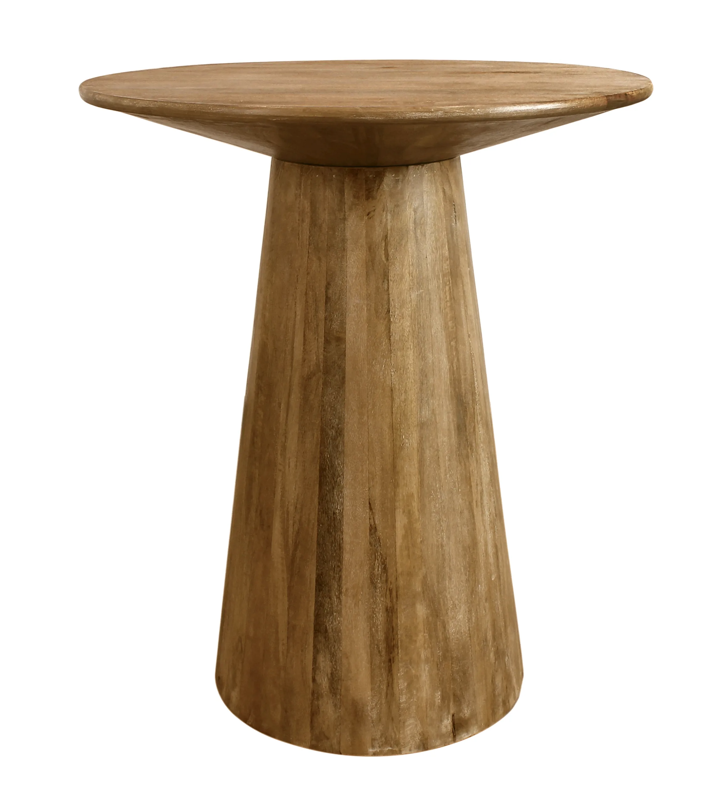 Scandinavian simplicity meets Mid-century modern style in our Jade 36’’ round solid wood bar table. Masterfully crafted in India from solid kiln-dried mango wood, the circular table top showcases gorgeous natural wood grain color variation while the flared pedestal base provides clean-lined, solid support. The table’s timeless design allows it to blend beautifully with existing décor, making it a gorgeous addition to any dining space.