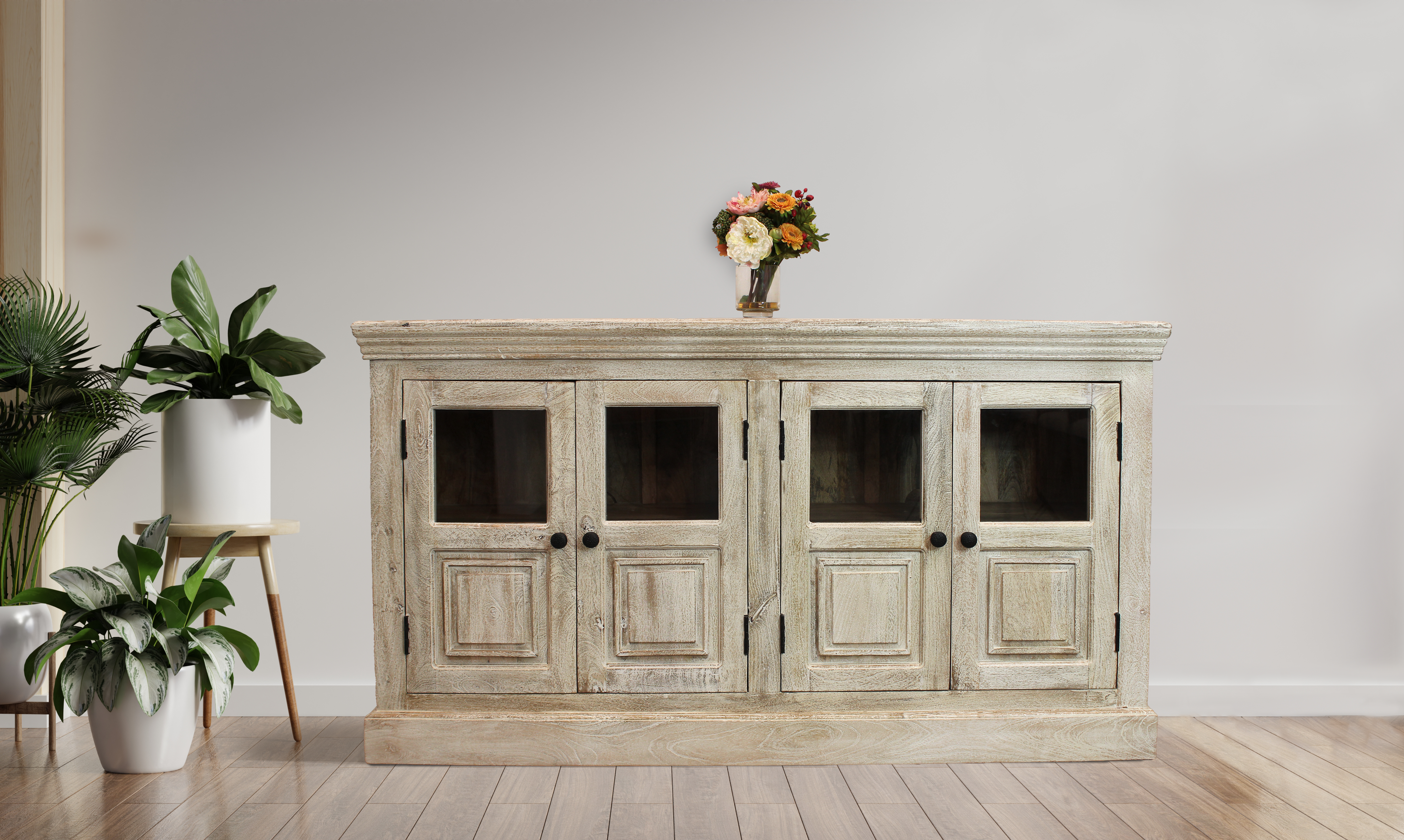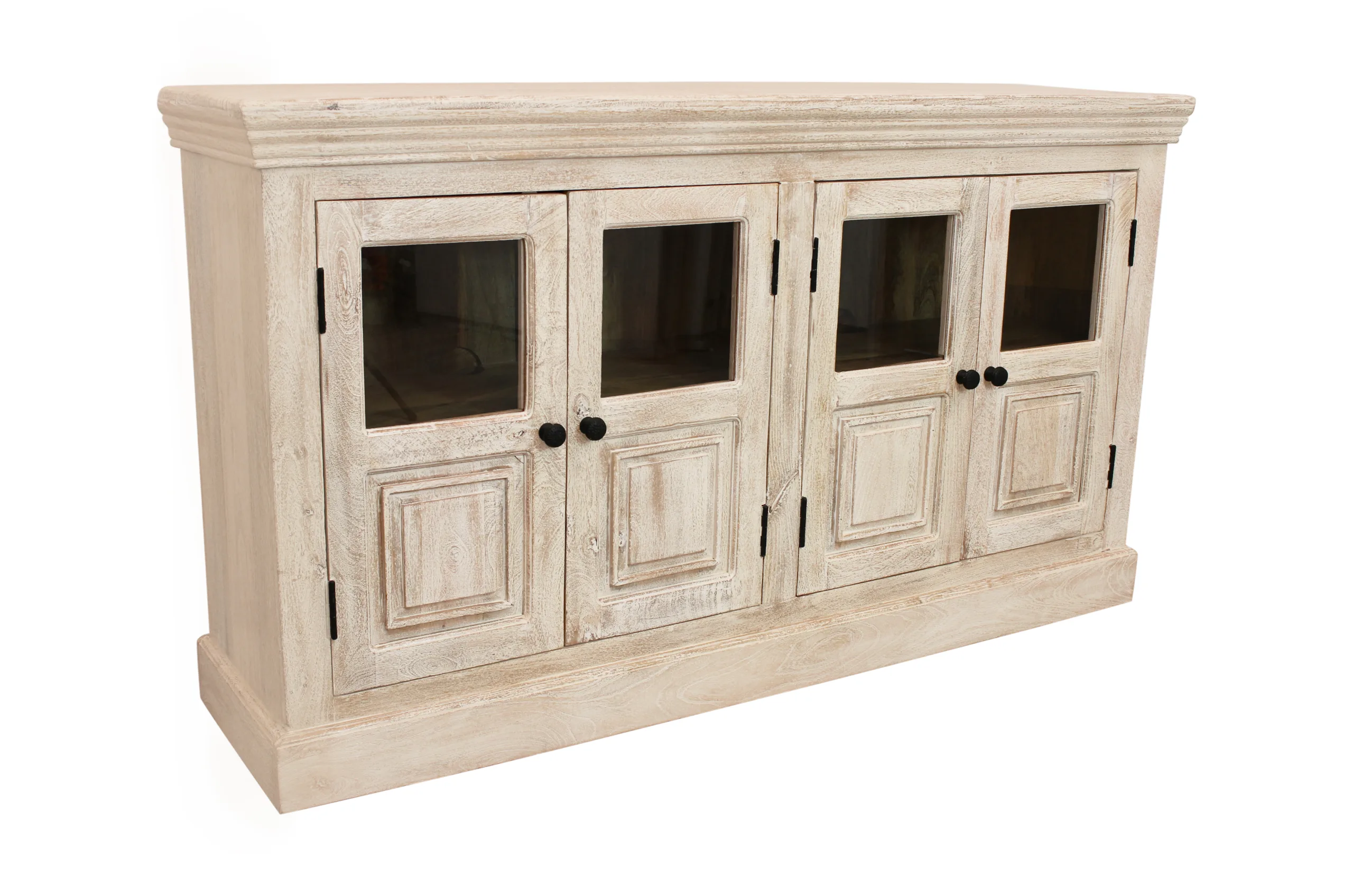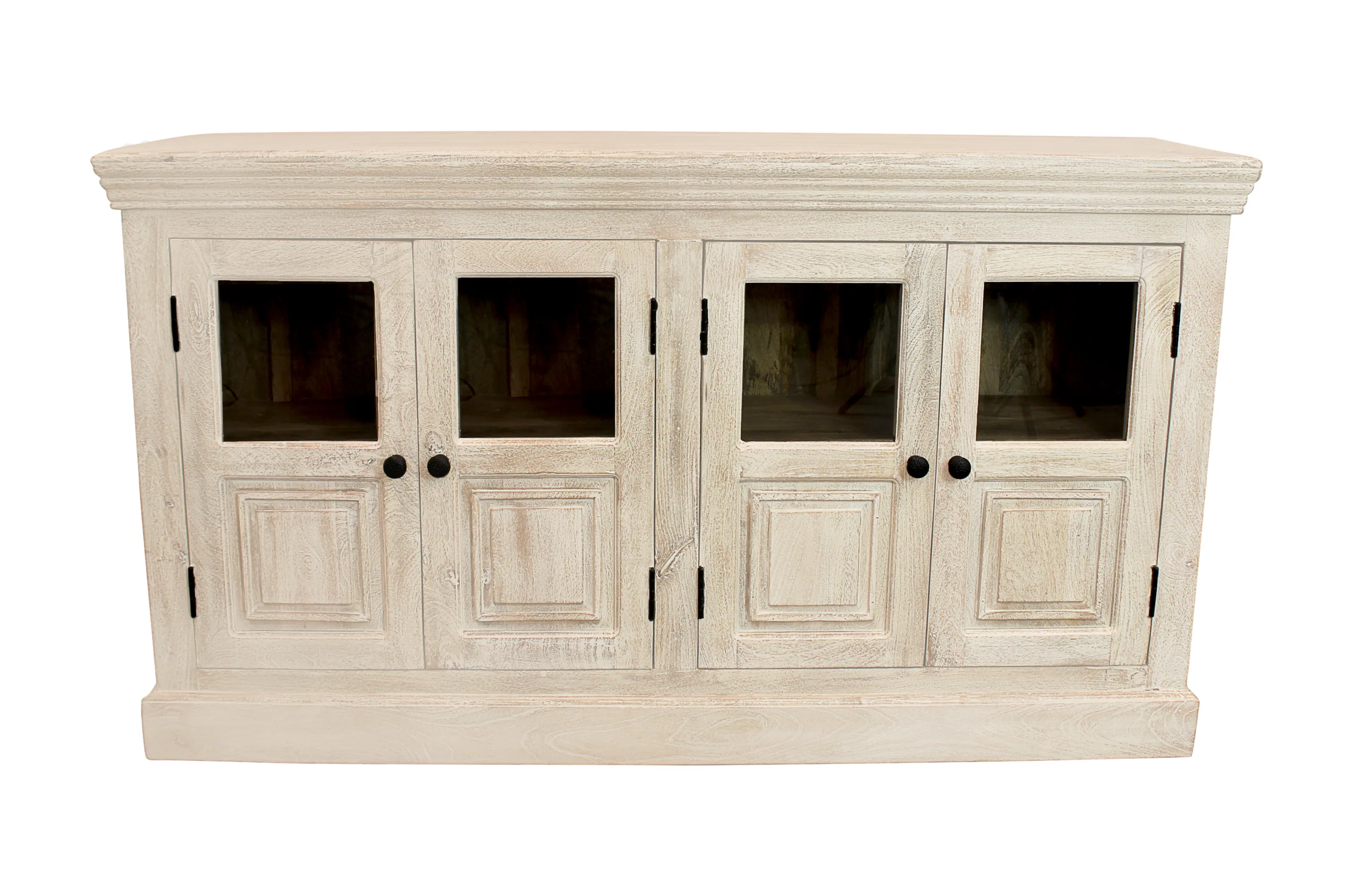 The Tropez 4-Door Solid Wood Sideboard is masterfully hand-crafted in India. Four doors feature solid mango wood on the bottom and clear glass on the top, allowing for both hidden and displayed storage. Each door features a removable metal handle and interior magnetic cabinet catch, ensuring doors are both easy to open and will remain firmly closed. With two internal shelves, this gorgeous sideboard is the perfect addition to any living space where additional stylish storage is desired.