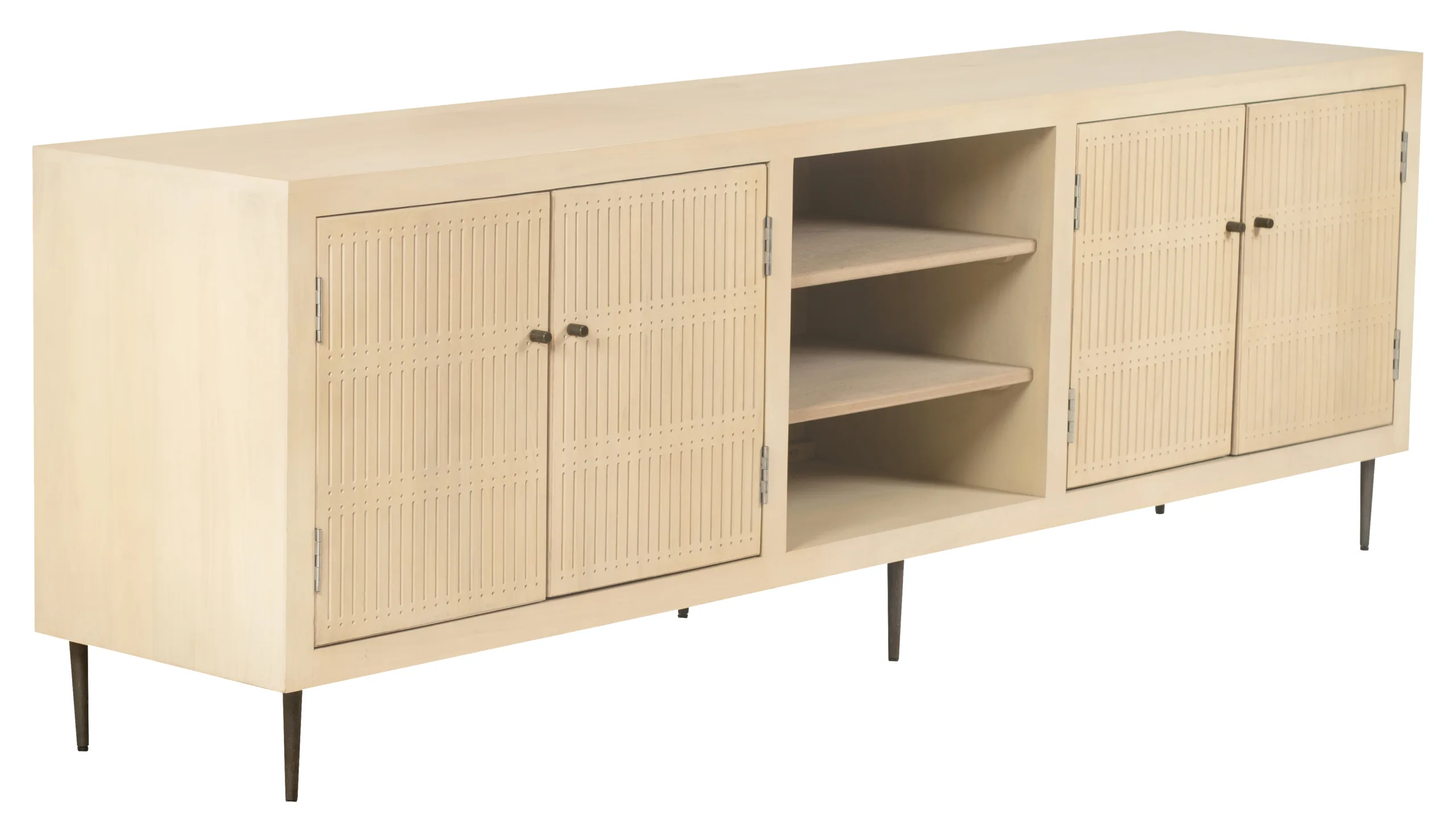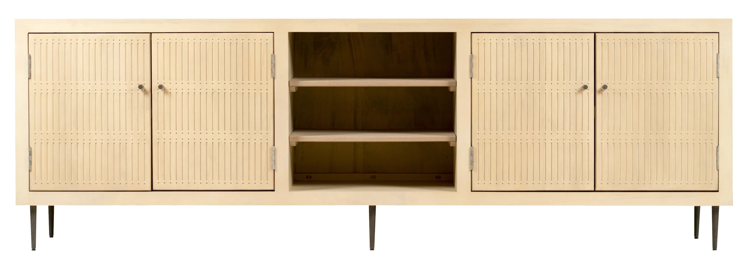 - Features 4 solid wood doors with unique geometric, hand-carved designs allow this piece to stand out as a true statement selection