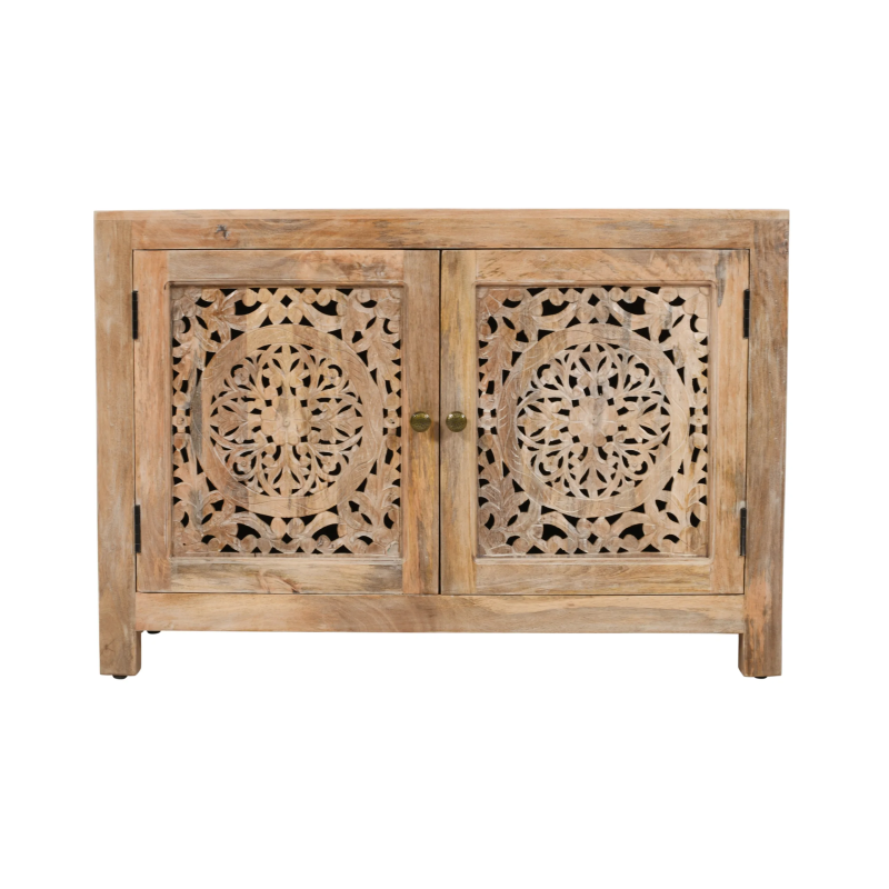 This beautiful 2-door accent cabinet brings a touch of natural, coastal elegance to any living space. Masterfully crafted from solid mango wood, the cabinet’s two hand-carved doors open to a spacious interior shelf, allowing for convenient-yet-chic storage that helps maintain a clutter-free lifestyle. Crafted in India, this piece is finished in a natural light brown for an additional air of boho beauty.