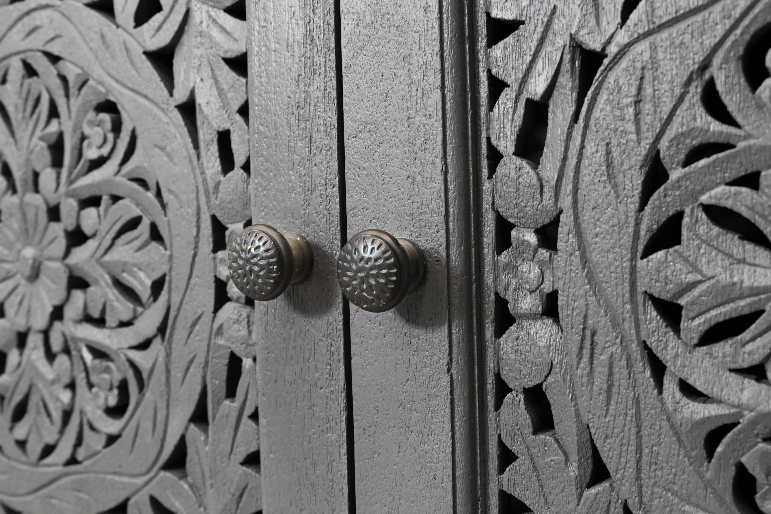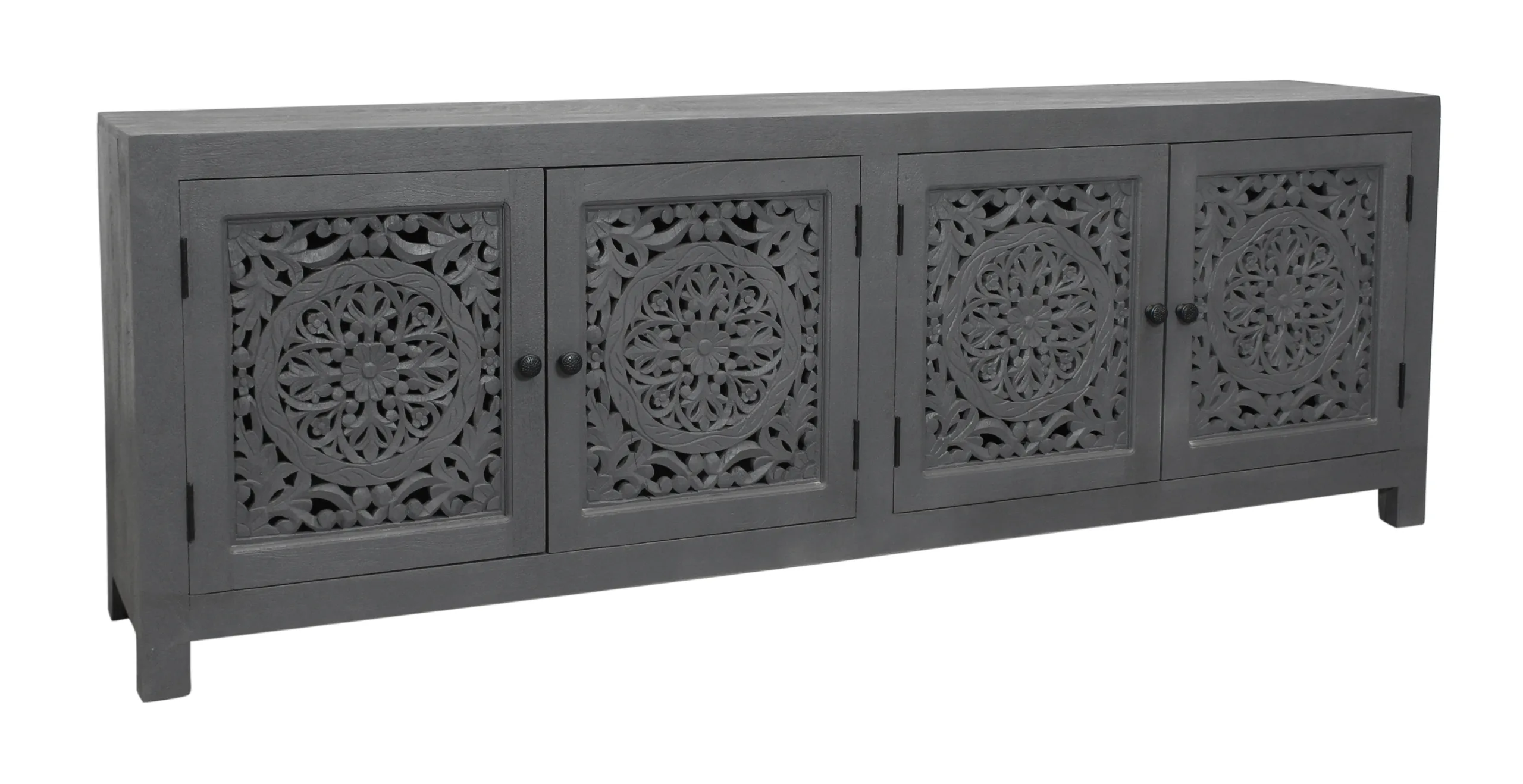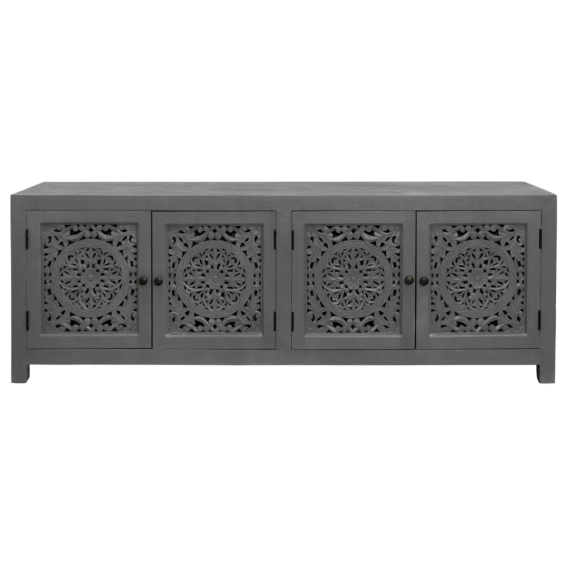 This solid wood accent cabinet doubles as a sturdy, stylish media cabinet. Four doors feature gorgeous hand-carved floral medallion engravings for a touch of chic boho style. The doors open to ample interior storage space with two large shelves, allowing living spaces to stay organized and tidy. The back of the pieces features two cable management cutouts to help keep cords organized and out of sight. Finished in a soft gray, this piece arrives fully assembled for additional ease.
